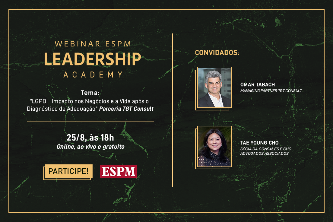 A ESPM realiza nesta quarta-feira, 25, mais um encontro do programa Leadership Academy. Desta vez, em parceria com a TGT Consult – empresa de pesquisa e consultoria em tecnologia – o encontro de executivos abordará o tema “LGPD – Impacto nos Negócios e a Vida após o Diagnóstico de Adequação”. Para o debate, o webinar contará com a participação de Omar Tabach, managing partner da TGT Consult; e Tae Young Cho, sócia da Gonsales & Cho Advogados Associados.